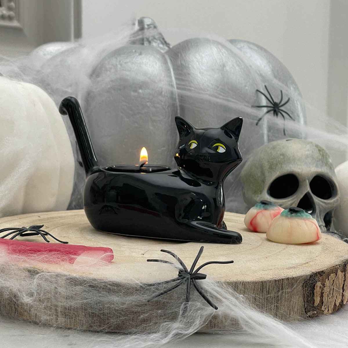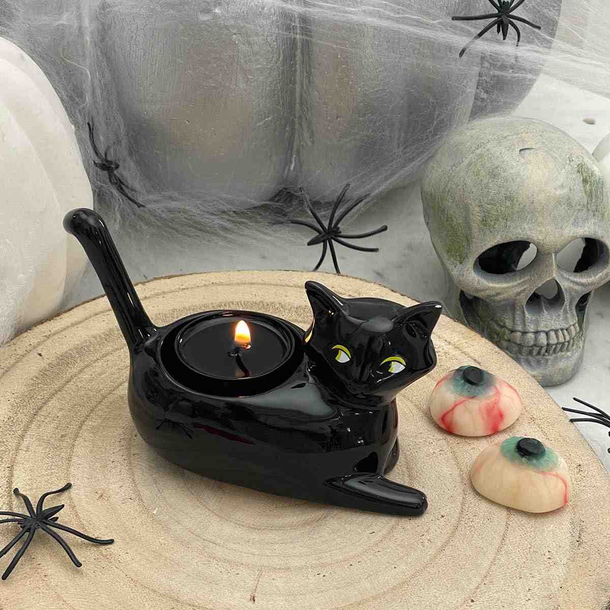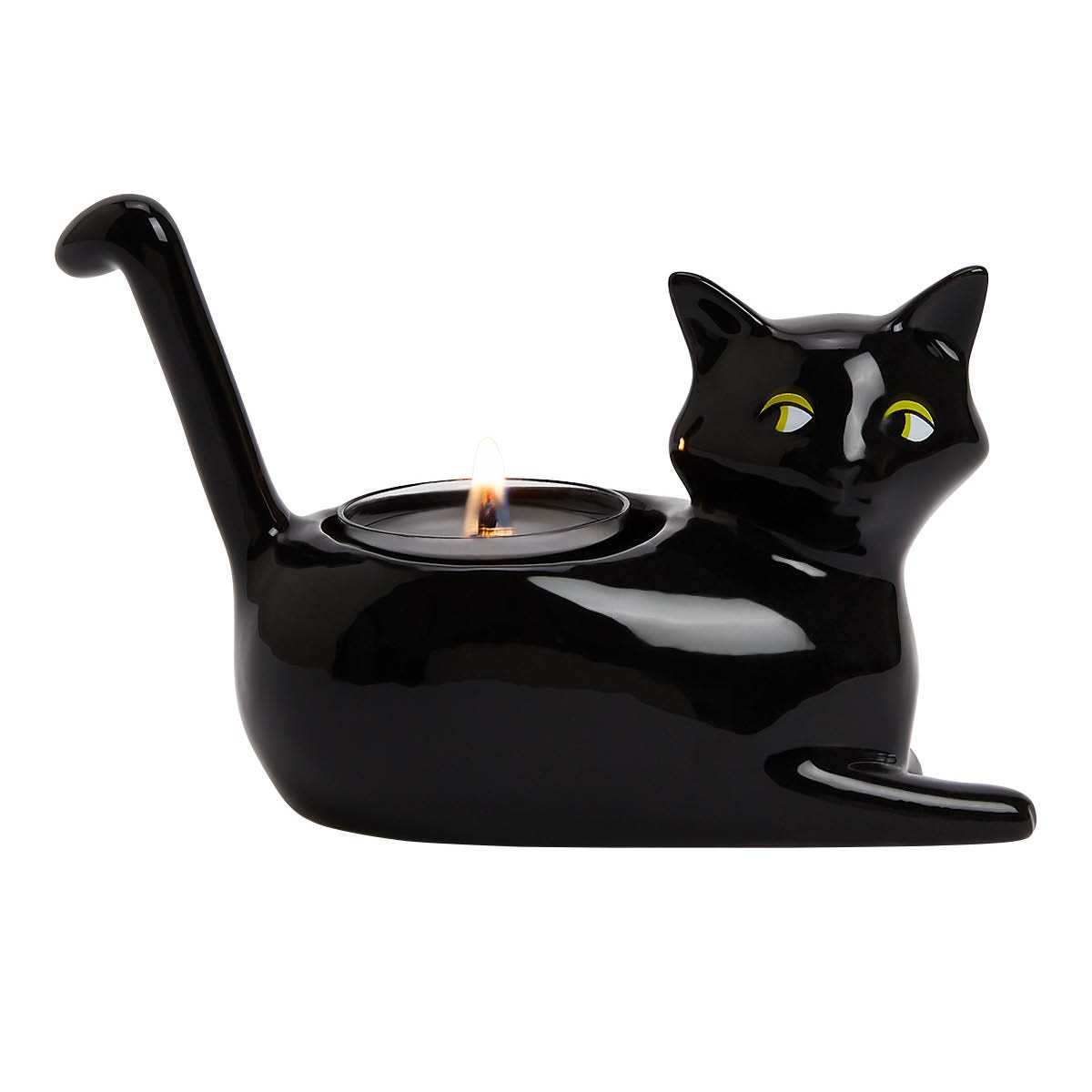 This tealight holder is perfect for feline lovers. The lounging black cat is lit by a tealight and eyes you sideways as it crooks its tail with attitude.