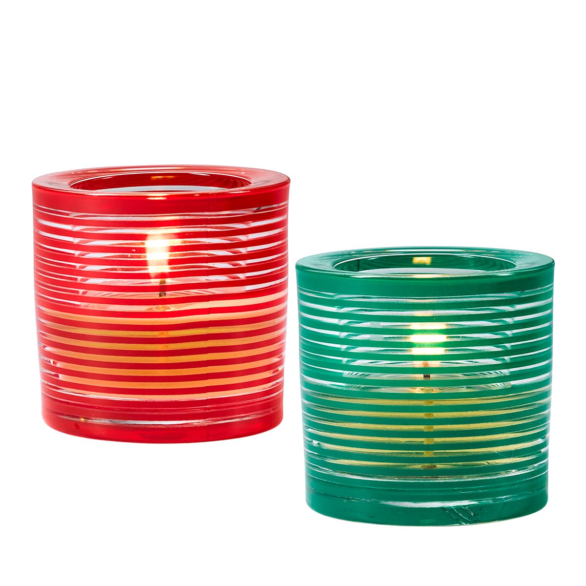 Deck your halls with beautiful décor thanks to our fabulously festive Votive Holder Pair. Using Classic Holiday colours for a classic holiday home, this set features modern stripes for an extra stylish touch. Glass (tealight, votive).