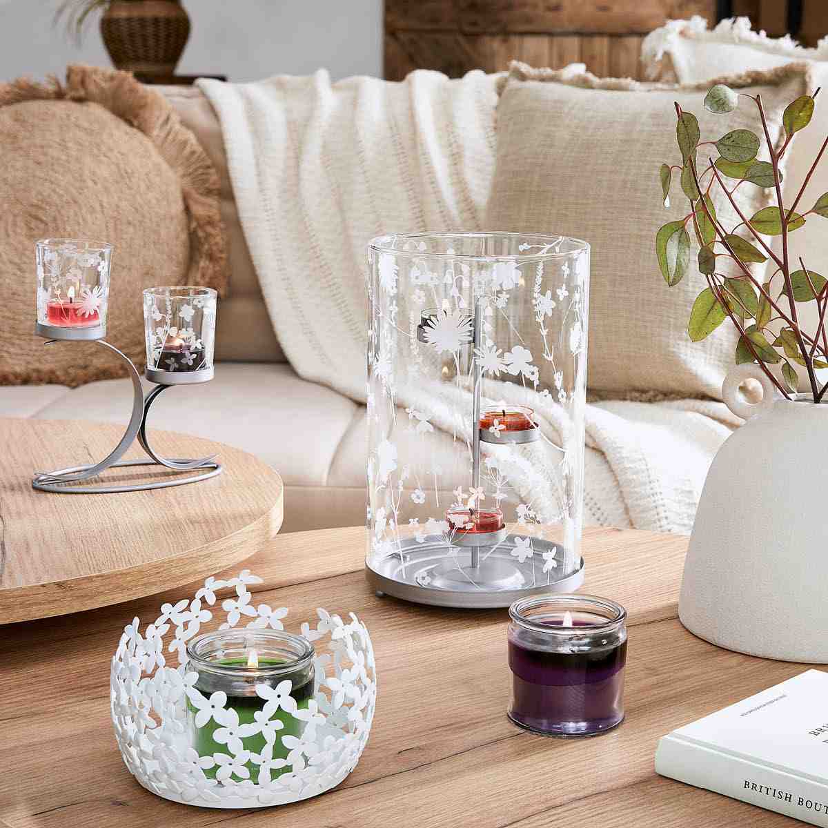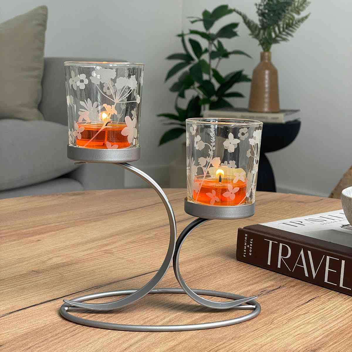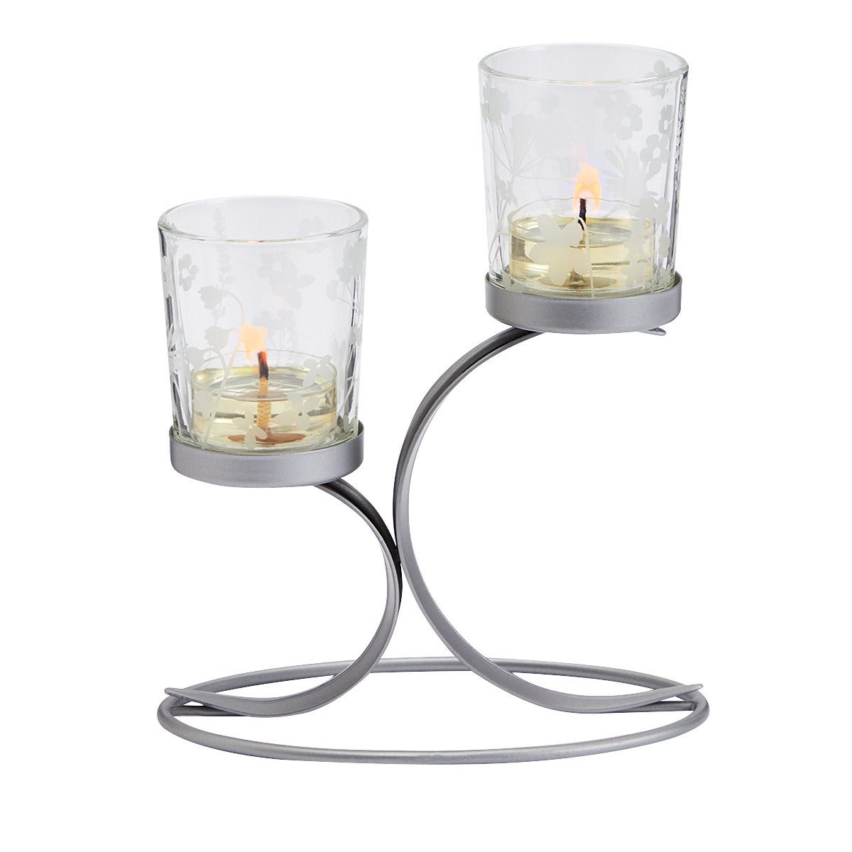 Create a quaint, back-to-nature look with the delicate florals and natural colours of this centrepiece candle holder. Clear glass is sandblasted with a cascade of mini frosted flowers. A powder-coated metal stand holds two glass cups at varied heights.