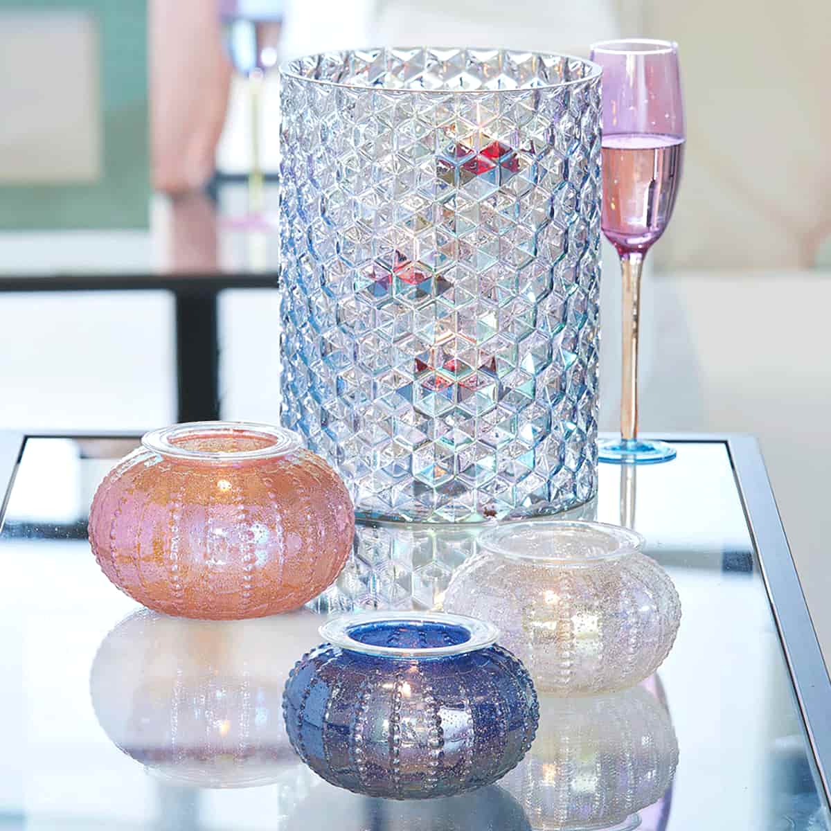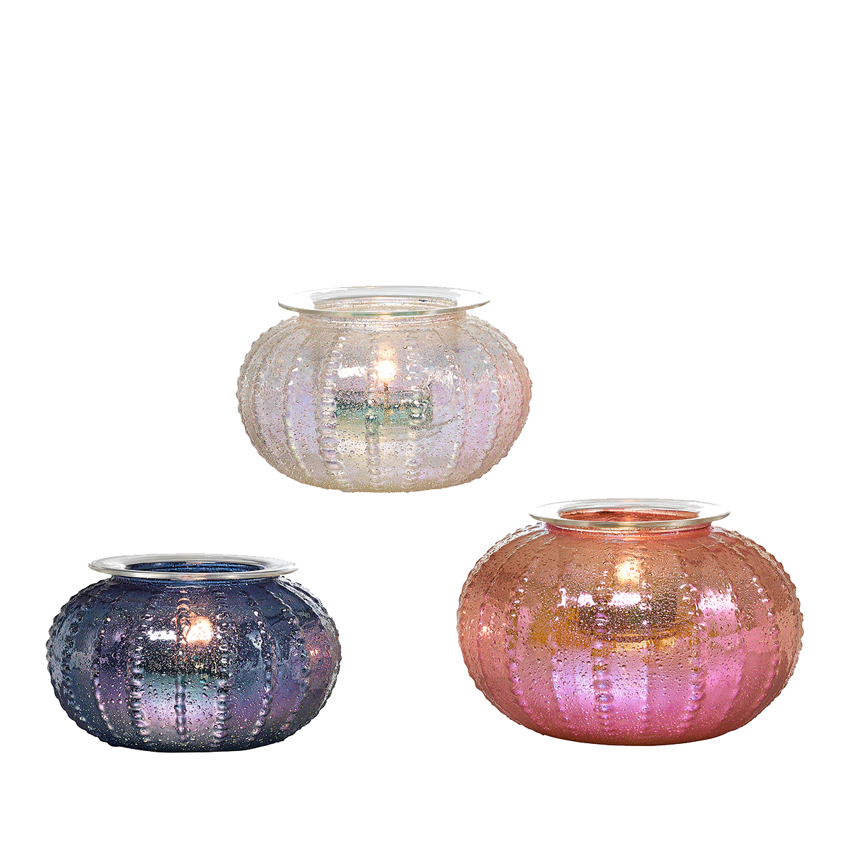 Exotic iridescence comes straight from the ocean depths with this trio of glass tealight candle holders. Their sea urchin design has a shimmering coloured outer, with suspended glass cups inside to hold your candles. Burn tealights in suspended cups only.