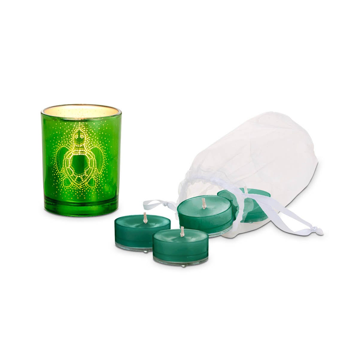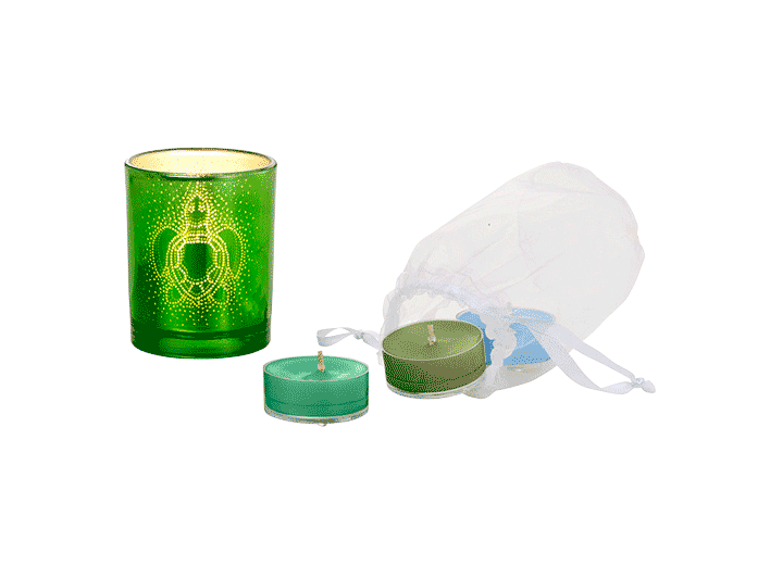 Get this cute Illusions Sea Turtle Tealight Holder Set from PartyLite. Includes an organza bag, a green coloured tealight holder glass cup with a sea turtle design and four tealights in our fresh fragrance Sweet Forest Fig. Get yours now!