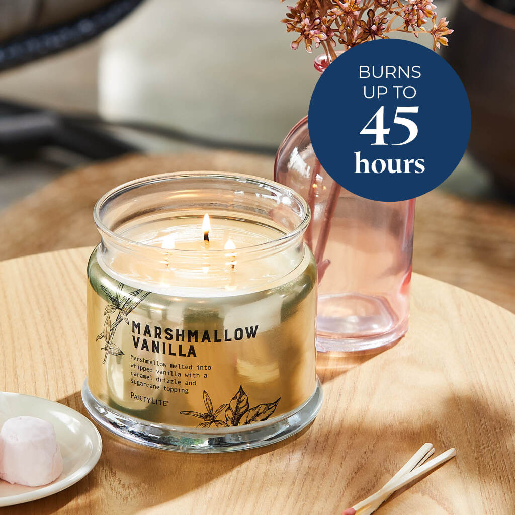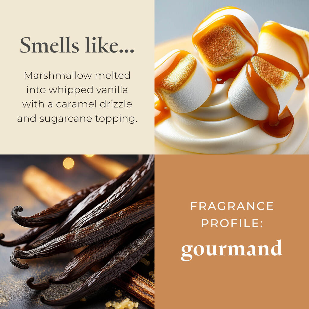 Marshmallow Vanilla is a blend of marshmallow and whipped vanilla melted with a caramel drizzle and sugarcane topping. Enjoy it in our premium fragrance form, the 3-Wick Jar Candle.