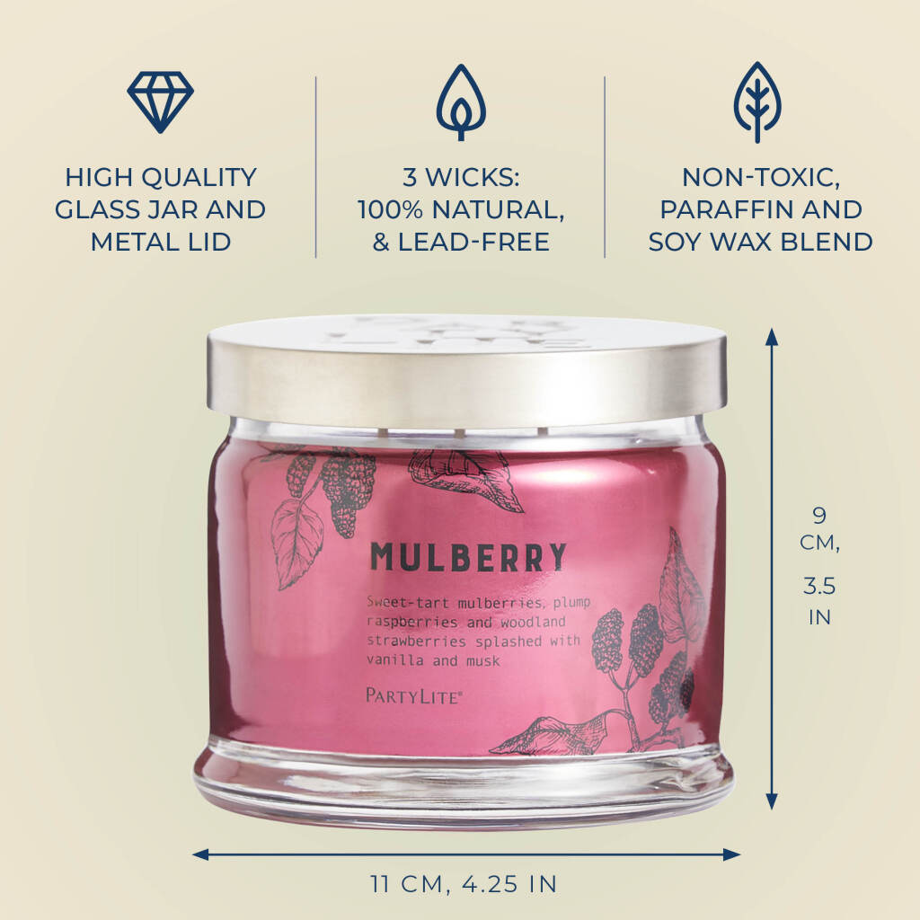 With a burn time of up to 45 hours, this Mulberry 3-Wick Jar Candle is our premium fragrance form. Fall in love with a seasonal blend of sweet-tart mulberries, plump raspberries and woodland strawberries splashed with vanilla and musk.