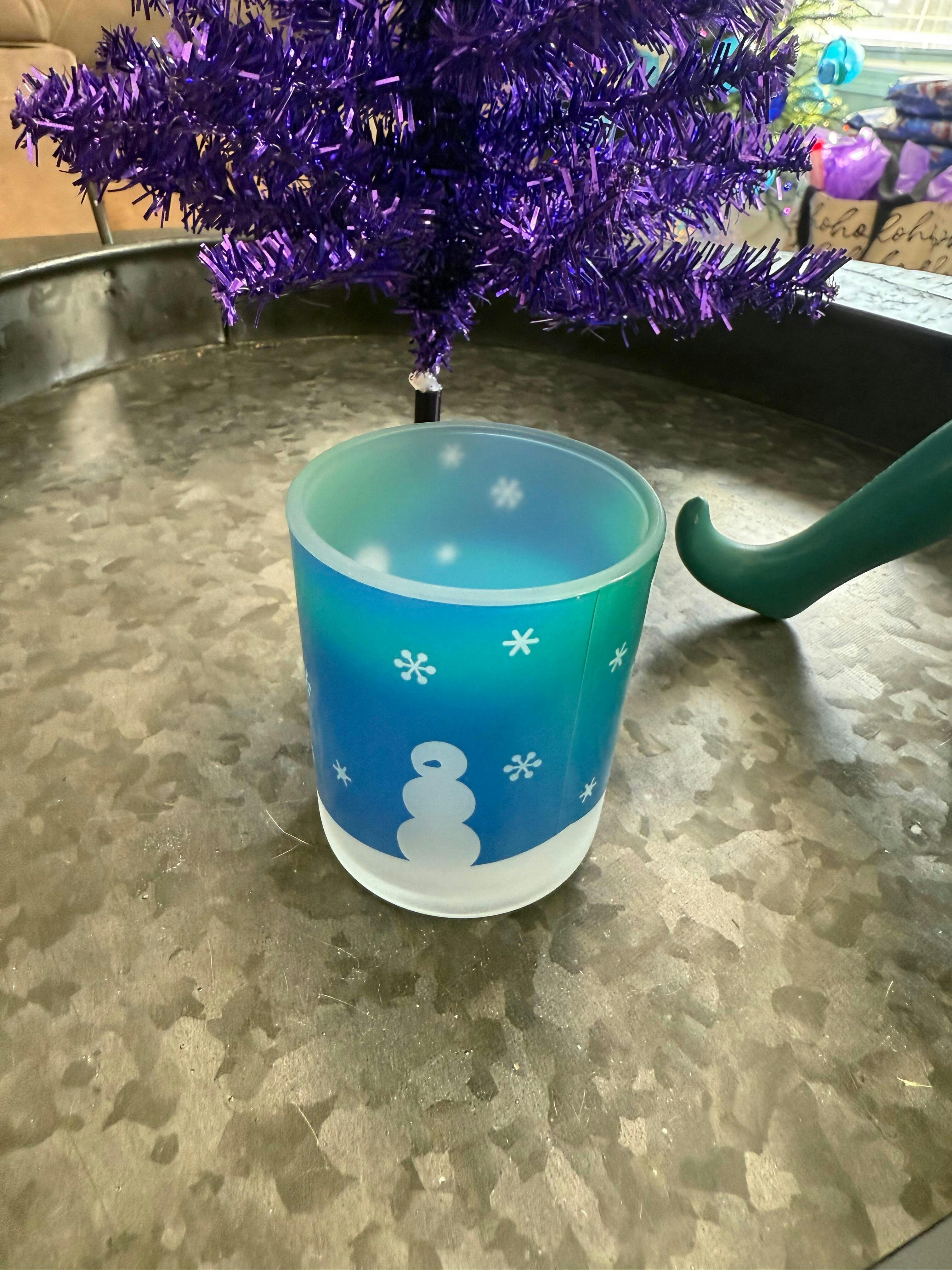 Capture the magic of a winter night with this beautifully decaled tealight holder. Featuring playful snowmen set against a snowy blue and green sky, the design comes to life when lit – casting a soft glow that evokes the wonder of the Aurora Borealis. A cosy, luminous accent for the season.