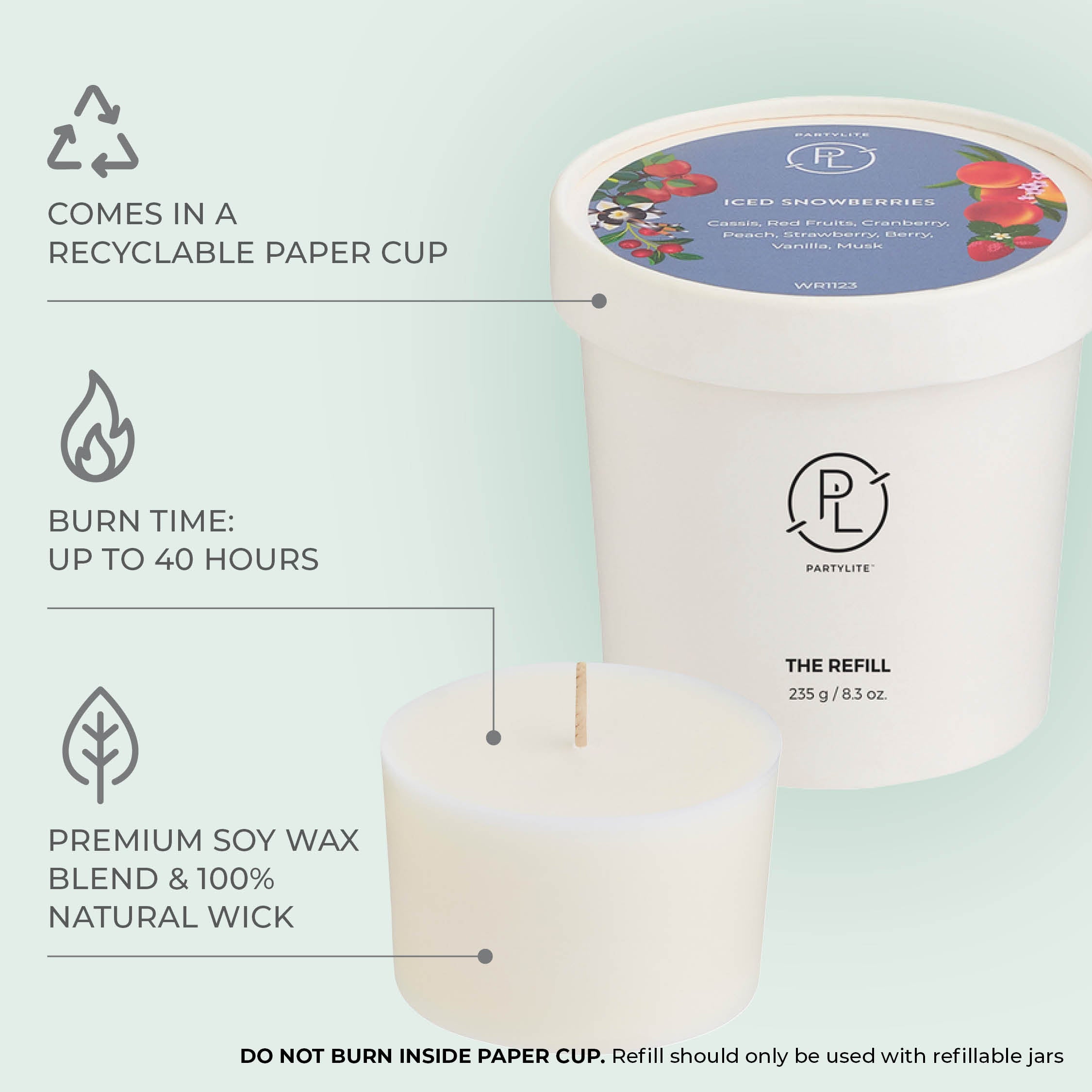 Reinvigorate your refillable jar candle with our natural wax refill, scented with the delightful Iced Snowberries fragrance. This refreshing aroma blends fresh-picked peach and golden apple with the crispness of cranberry and the coolness of cassis, creating a vibrant and fruity scent. Each wax refill arrives in a convenient lidded paper cup. Simply pop it out and insert it into your refillable glass jar to enjoy. Ensure not to burn the wax in the paper cup.