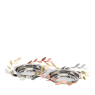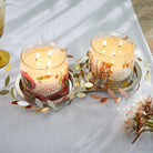 Solid base candle holder to fit 2 Jar Candles, with leaf motif. Gold, silver and rose tones of finished metal.