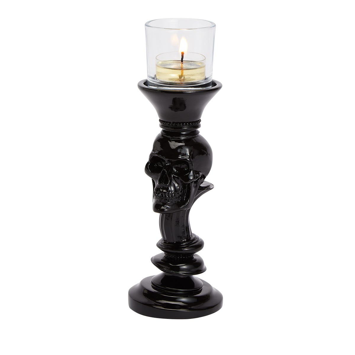 Spooky and stylish home décor is yours this Halloween, with this eerie and elegant candle holder. Made to use with our tealights or taper candles, this tall holder in glossy black comes with a glass cup for votives too.