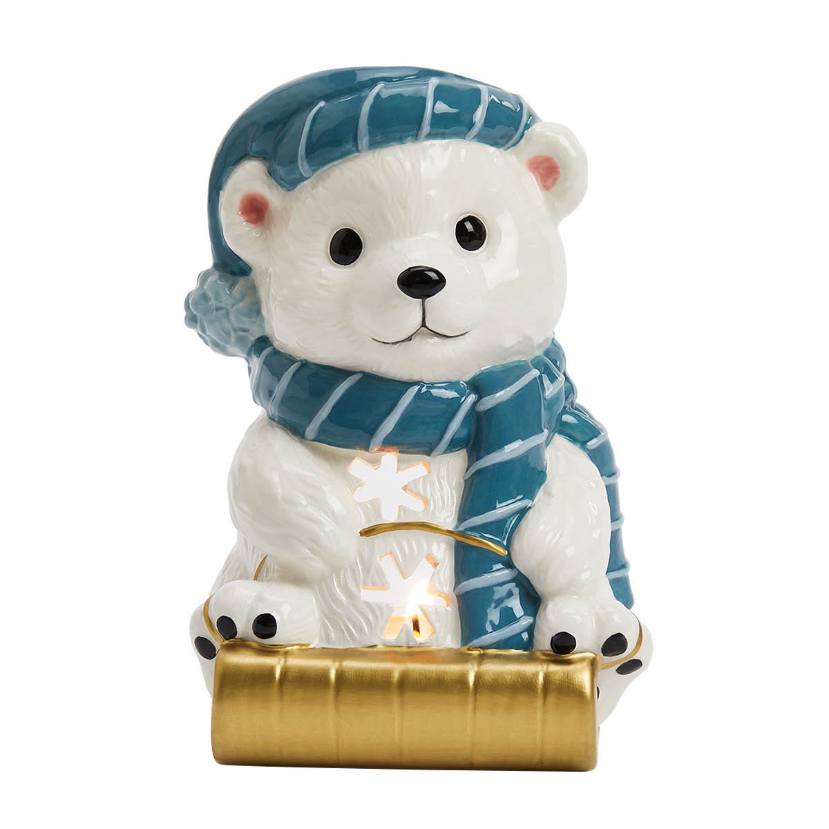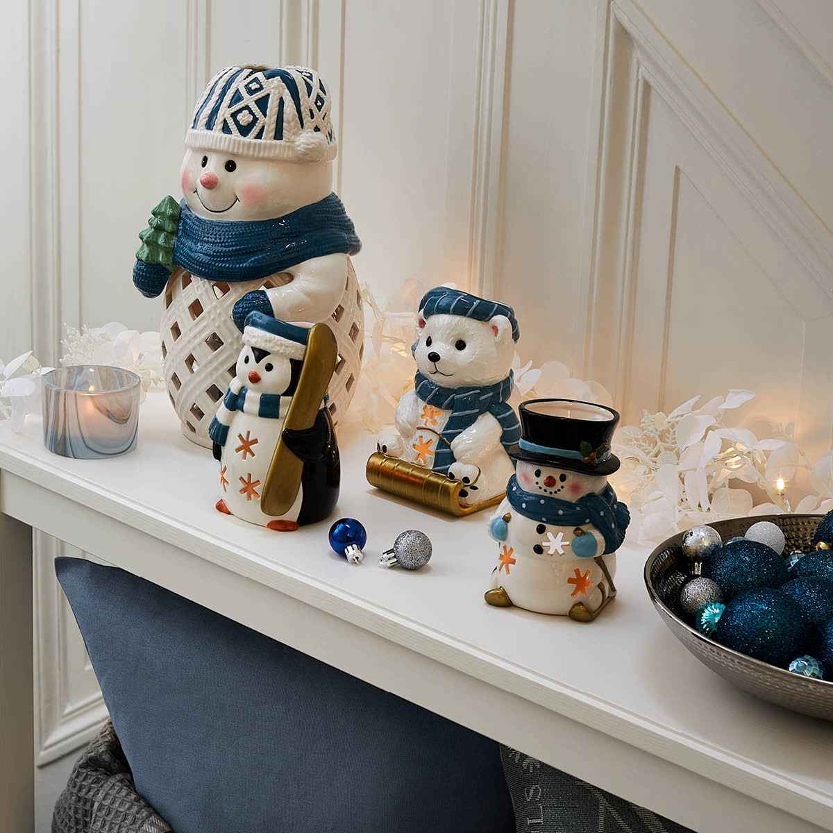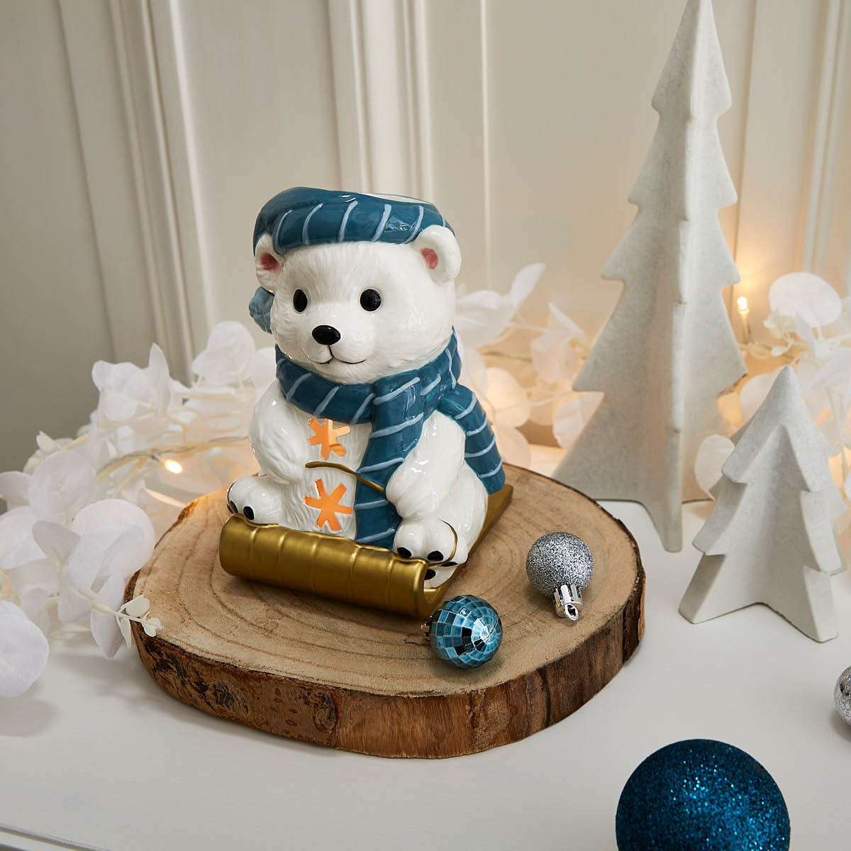 This beautiful ceramic tealight holder features an adorable sledging polar bear that is cute enough to cuddle. It sits perfectly alongside our Penguin Snowboarder (P93719) and Skiing Snowman (P93720) tealight holders.