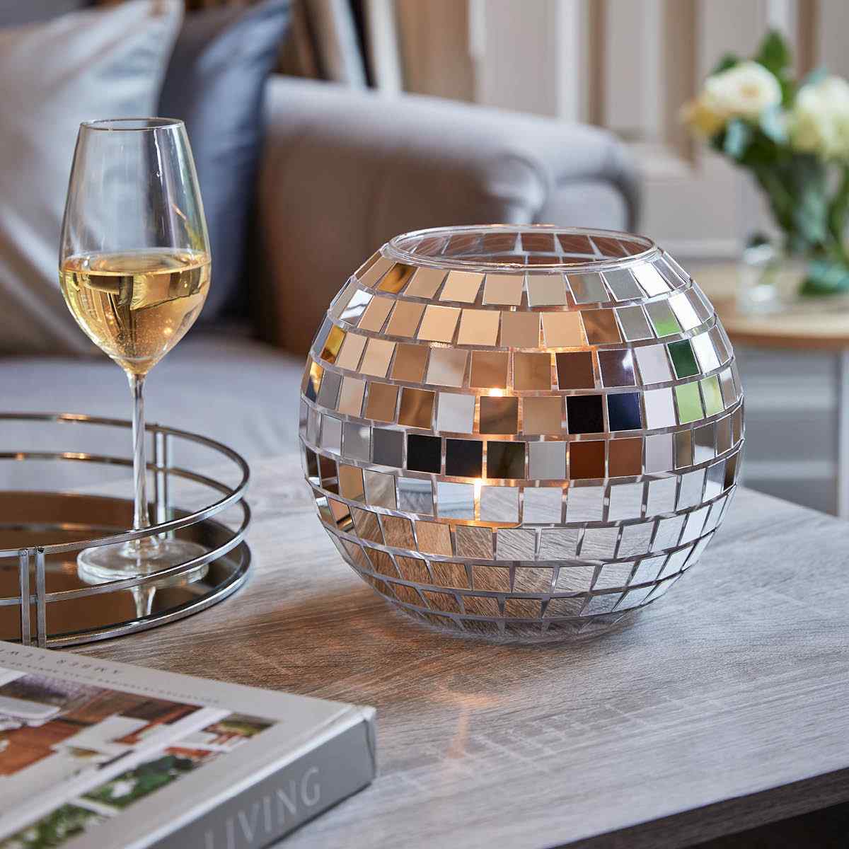 Make every room into the disco dancefloor with this sparkling mirror ball candle holder. Inspired by 70s style, the mirrored mosaic bounces candlelight around inside. Use it with our Color Stop Candle Base for a full disco effect. Includes tealight tree. Can be used with Tealights, Large Tealights, Escential Jar, 3-Wick Jar, and GloLite Jar.<br><br><div style="font-size: 70%; line-height: 1em;">Fragrances and candles sold separately.</div>