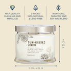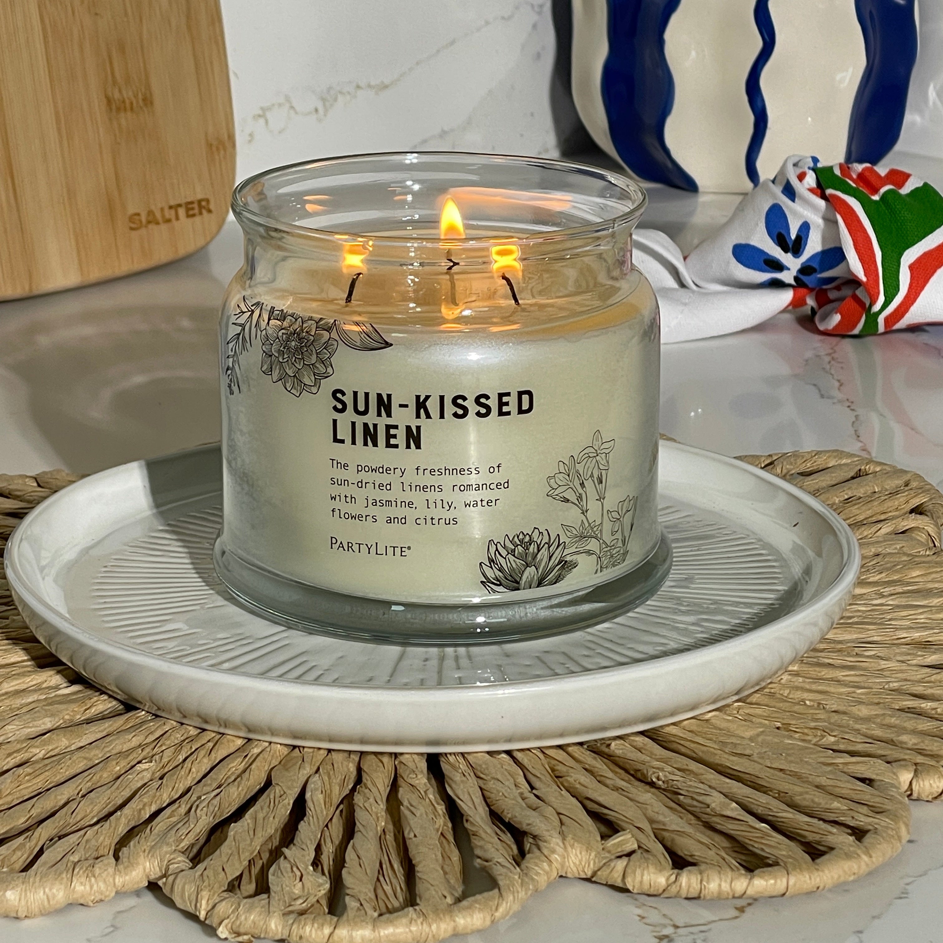 Our 3-Wick Jar Candles will transform your home with fragrance. With Sun-Kissed Linen, you’ll enjoy the powdery freshness of crisp linens, romanced with a musk of jasmine, lily water flowers and citrus.