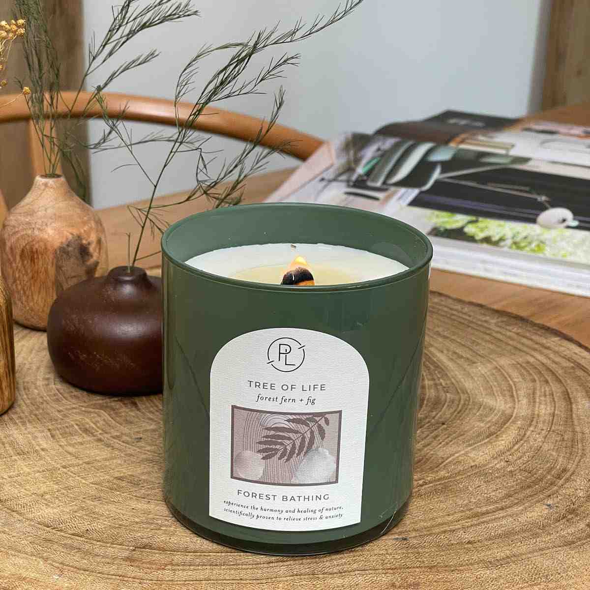 Tune into the relaxation and restorative powers of nature. This natural wax jar candle, with a crackling wooden wick, features fragrance that harnesses natural compounds that reduce stress. Enjoy a blend of forest fern and black fig that connect you to the tree of life, using Phytogaia™ technology.