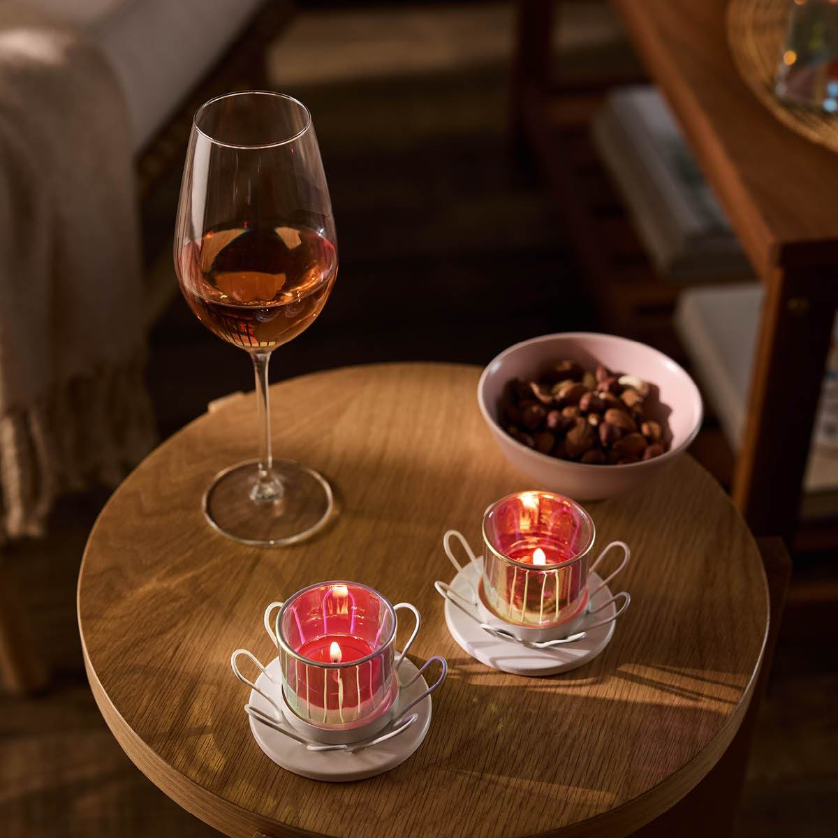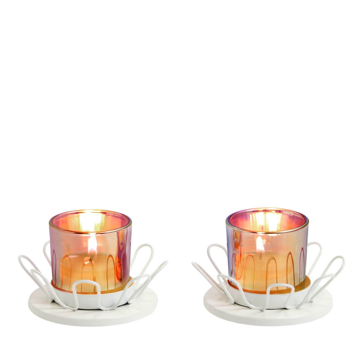 Let a playful pair of iridescent candle holders cast dancing reflections from candlelight. This duo of tealight or votive holders has a modern wire flower design at the base of glass cylinders. When you place your candle inside, you'll light up shining tones of pink and pastels, a perfect slice of summer fun.